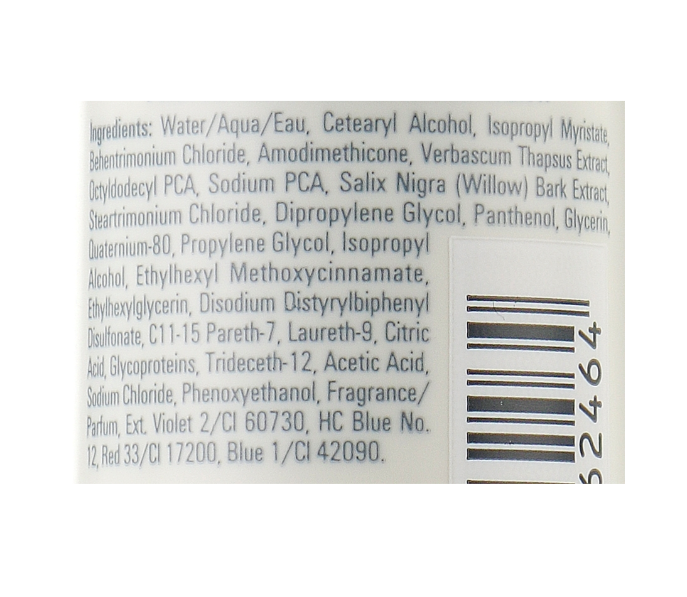 Aqua (Water), Cetearyl Alcohol, Behentrimonium Chloride, Amodimethicone, Hydrolyzed Rice Protein, Panthenol, Hydrolyzed Wheat Protein, Tocopherol, Citric Acid, Trideceth-12, Cetrimonium Chloride, Disodium EDTA, Benzophenone-4, Parfum (Fragrance), Limonene, Hexyl Cinnamal, Linalool, Violet 43 (CI 60730), Phenoxyethanol, Sodium Benzoate, Potassium Sorbate.
